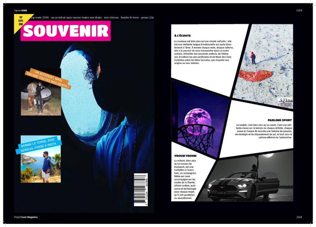 Projet de création d’une couverture de magazine et d’une page intérieure reflétant ma personnalité à travers trois aspects clés. L’objectif : imaginer un concept original et cohérent, avec une identité visuelle forte.